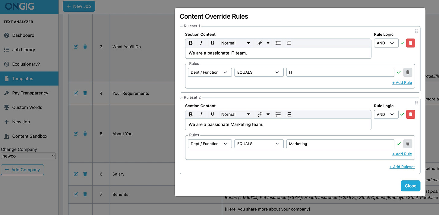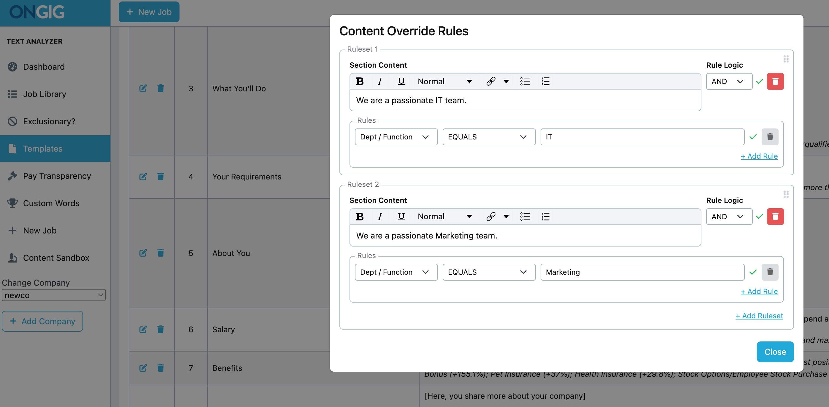 Instead of building 27 versions, we used one core template in Ongig’s Text Analyzer. Then we created override rules.